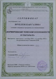 Выдан: Институт Аналитической психологии г.Москва (2009 г.) - Формирование телесной осознанности в гештальте