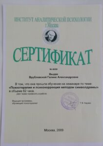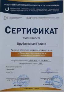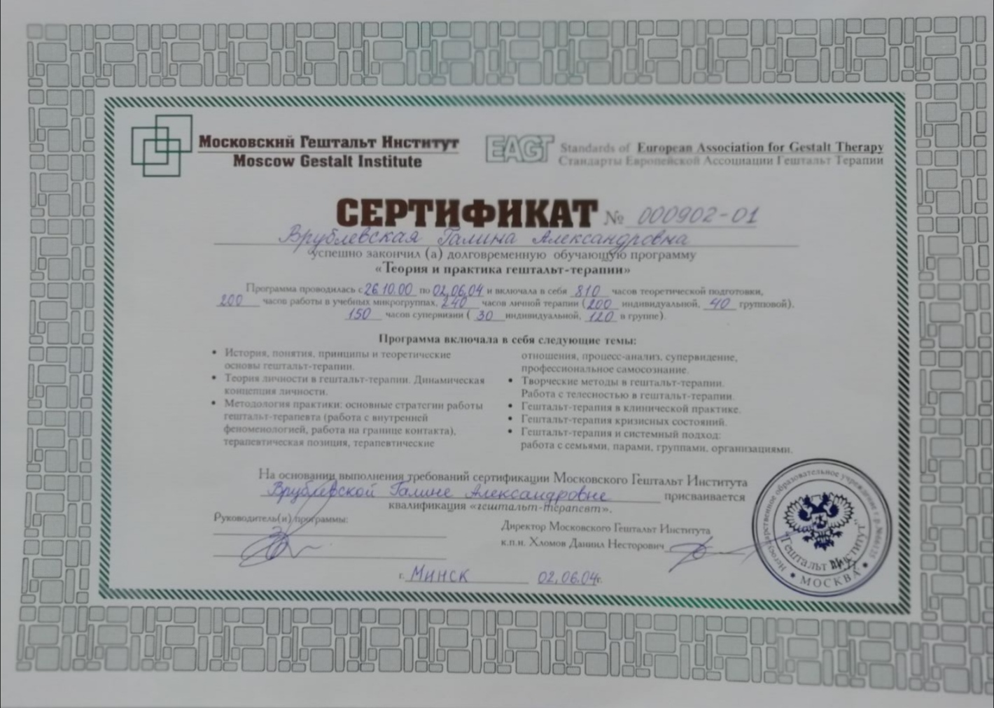 Выдан: Общество практикующих психологов «Гештальт-подход» (2017 г.)